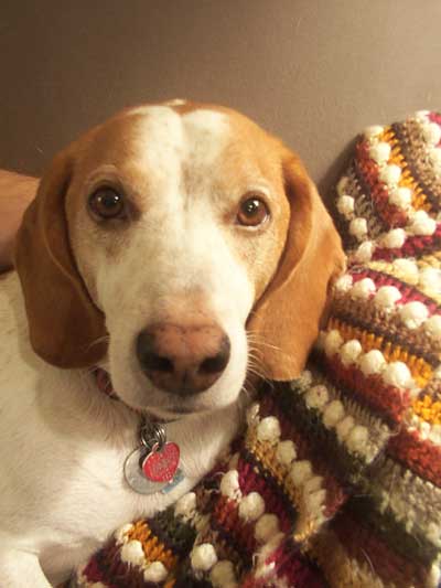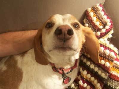 | I didn't get the Cables & Garter Pullover done over the weekend. Why do sleeves always take longer than I think??? I also had Matt do a sleeve length test, and the sleeves need to be about 2" longer (which is what I'll do today). The good news is that I have enough yarn. This is the first time I've used Galway, and that generous yardage threw me off (to only have 3 skeins to do sleeves just didn't seem like it was enough). I will not have much (if any) leftover, but I'll have no problem finishing this up. I have not cast on a new project since I started this project September 24. I even got new yarn over the weekend! (I snagged some of the Jo Sharp Silk Road Aran to make Matt a sweater). I think I'm going to extend my due date of "3 Finished Projects in October" to November 9th (that's when Halo 2 is out, and all knitting will come to a complete halt so I can play 16 hours straight... and don't think I won't). While I was showing Matt a couple of ideas for that lovely Jo Sharp yarn, he subtly hinted that he wants a fair isle (specifically, "whatever happened to that neutral multicolor sweater that you showed me that one time") hmmm... I show Matt a lot of patterns to see if he likes them. After some questions on what it looked like, it was the sweater from Chesapeake Collection. Instead of working that one right now (I don't have the yarn for it yet), I'll concentrate on finishing up his Natural Beauty Fair Isle. If you've been reading my blog over the last 2 years, you'll know that I don't do a lot of Fair Isle knitting. I like doing cables and texture knitting. I've started a couple of fair isles, but the only one I've ever finished is the PW Kool Aid Colour Your Own (and it is one of my favorite sweaters), but Matt has now mentioned a couple of times he wants a 30's style vest or sweater (we watch a lot of Poirot). So I'll have to work the Natural Beauty back into the rotation again. Wow, this was a long post. Here's a cheating Monday Morning Pet Photo. It's the "outtake" from last week's great picture of Jake. Some times you gotta make sure the camera isn't a food item. |