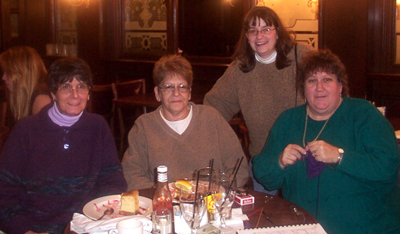 | Doesn't look like much yet, but I hope to get some more done today. I do have a few errands to run (including getting my new contacts). Speaking of me and glasses, here's a picture from Saturday with some of my online knitting buddies at a little get together: |