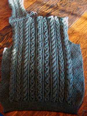 | Pattern: Cables 101 Vest Source: Twists & Turns Yarn: Cascade 220 Color: Dark Green Heather Needles: 5''s & 7's Gauge: 20sts x 28 rows to 4" in st st |