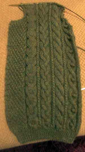| I figured once I worked on the Cozy Shawl Collared Aran Pullover, I would get it out of my system and get back to work on the Cables 101 Vest. After a bit of a set back (remind me in future to do V-neck cardigan's fronts at the same time, as I went an entire repeat too far on the right front and didn't notice until I had 2 repeats done), I'm done with the shaping until I hit the shoulder! | ||||||||||||||||||||||||||||||||||||||||||||||||||||||||||||||||||||||||||||||||||||||||||||||||