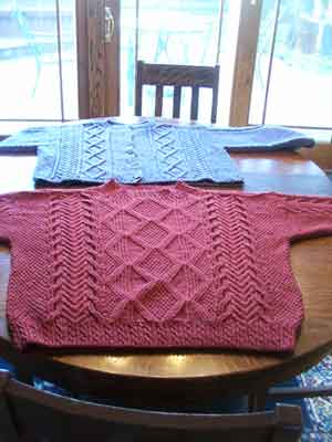 | I understand there are actually people who use their dining room table for things like eating. That's actually my first washing/blocking on Inishmore. I had been procrastinating on it. Part of me was secretly hoping the yarn would soften up and the sweater would be a little more comfortable to wear, but the other part of me knew this wasn't going to happen, so I kept putting it off. The second part of me was right. Not any softer. The rest of my day was spent with Gorden Freeman. I'm trying to play Half-Life 2 on my laptop. No mouse and it's a bit awkward (why does the spelling of "awkward" look awkward?). So I think I'm going to pick up a gamepad for the PC. I also had a pair of sock needles lost yesterday. Gena had been leaving my knitting alone, but I've also been trying to keep the wooden needles out of temptation's way, but the striped socks were left in range and the needles are now history. Gee, I need a store that sells computer games and knitting needles. They go together like books and coffee, right? Hmmm... a business venture just screaming to be implimented. I mean doesn't everyone knit during cutscenes or loads when they play games (and trust me: in Half Life 2, you get long loads... surprisingly long). Only other knitting I did yesterday was one row on Marilyn. At this rate, that baby will be done before the end of the decade! |