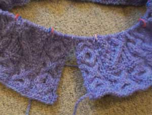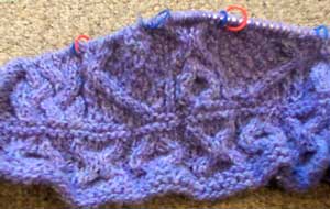 | I knew that once I got everything set up for Marilyn, the knitting would be a lot easier to deal with. It is. For those familar with the pattern: you'll notice the lack of bobbles. It's not that I completely dislike bobbles, but I'm particular about where and how many there are (I thought they worked really well on the Cables 101 Vest, but just didn't like them on this one). I replaced the bobbles with a moss stitch filler. So it's moving along. I think the stitch markers will be removed soon (they get in my way). I'll keep a few just so I contain some of the patterns, but I don't need all of them now that I can actually see the patterns. Have I mentioned how pretty this yarn is? Speaking of yarn. I bought some of the Knitpicks sportsweight cotton yarn to make a summer cardigan. The Orchid color is much pinker in person (I thought it was going to be a smidgeon more purply... not that I dislike the color I received, but it was slightly different). I told the yarn what it was going to be, but it didn't agree. All night I could hear it whine... "please swatch me for Cromarty*... I'm so beautiful with great stitch definition. I'm so soft that you can wear me next to the skin. Please just try me for Cromarty... you won't be sorry" All freaking night. So to shut it up, I swatched it. |