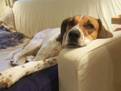 | Another block done for the Leisure Arts Sampler Afghan. Not the most interesting block. Either in looks or to knit, but it should look fine in the afghan (too many busy blocks can distract from the overall design, I think). It was a long day yesterday. A little road work on our street made getting to and from the grocery store a challenge, then of course the dogs had to try to scare off the huge pieces of road work equipment. I think they think it worked (as they did eventually leave), but it stressed them out that every car that drove by got a warning bark. Made for one very long day. Finally, some rest: |