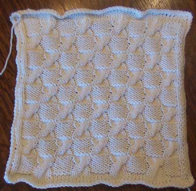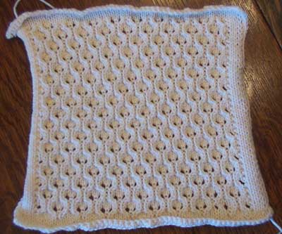 | Well, the Hourglass Eyelets has been done for a little bit, but I hadn't done the crochet edging on it yet. I'm trying to do them as I go, as I don't enjoy doing them. I am doing a slip stitch selvedge on the blocks and that has made it much much easier to do the edgings. I have started the next block and I'm about halfway thru it. I did mostly simple, easily memorized blocks, but I think I'll do a more complex one for the next one. Just to keep it interesting. I also continued working on Matt's Cable O's Vest. I've started the armhole shaping and should get all the decreases done today. Then it's just straight pattern stitch until the shoulder shaping. It's a really lovely vest and Matt's keeping me motivated to work on it (positive re-inforcement does wonders....) |