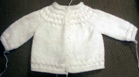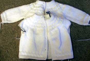 However, I hadn't planned on knitting up 4 baby sweaters or trying to finish up the Project Linus blankets. Sometimes other projects become a priority... Speaking of the baby sweaters, the first one is finished expect weaving in ends, buttons and blocking: