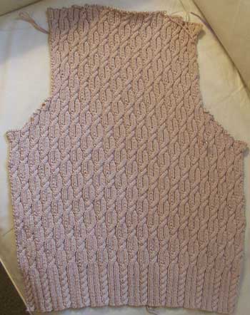 First, the Cable O's Vest is progressing. Matt really really wants this vest finished. I have no idea why I thought cotton would be a good idea. It looks beautiful, but not really a pleasure to knit: |