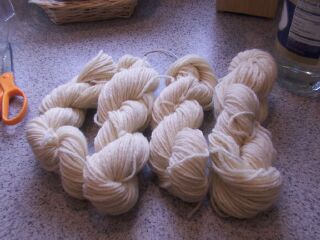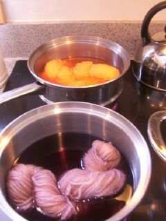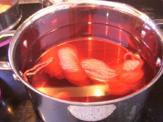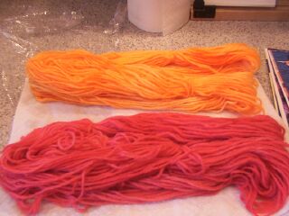 Okay, so this was MUCH easier than expected. I used the Philosopher's Wool method. The yarn is Lionbrand Fisherman's Wool (which I've got A LOT of...) I had to take the skeins down to hanks. Each hank is about 45g. The yellow could use an other dipping, I think I would like it brighter. Now what to do with it? I'm thinking an entrelac vest or sweater (if there's enough... or I could dye more) The book mentioned they use the Canadian strawberry and the US strawberry to get two different reds. Looking at the book, it looks like the Canadian strawberry is cooler (more blues undertone) and the US is a warmer red. All in all a fun way to spend a crappy day. |