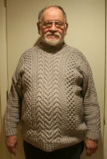 | Here's my dad almost smiling in his Na Craga. He picked the pattern, but not the yarn. Next time it will be a machine washable yarn for him. (He's afraid to wear it) |